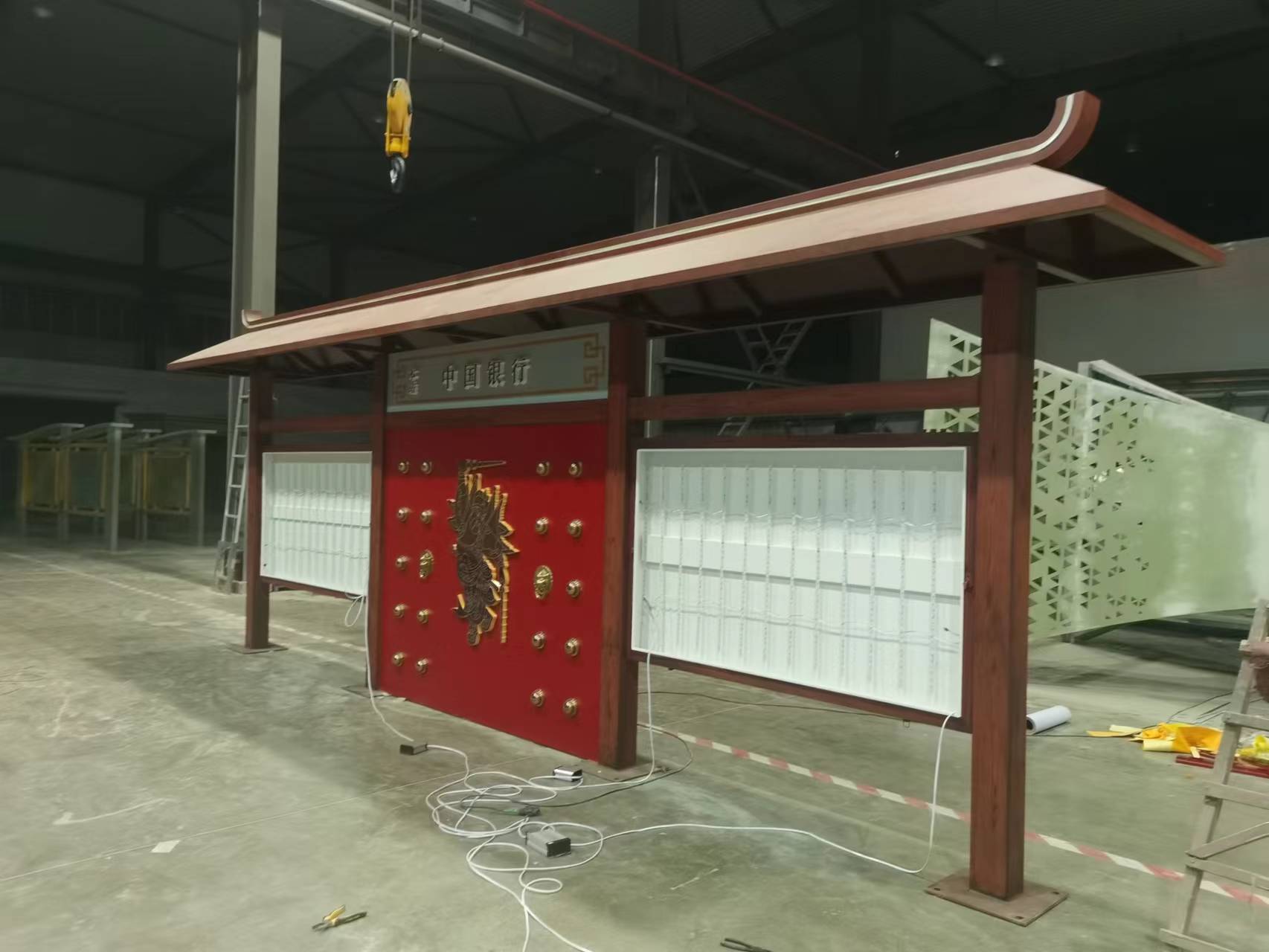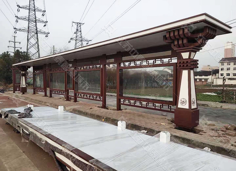 陜西漢中仿古中式候車亭,整體顏色以仿古色為主色調,表面采用靜電噴塑處理,氟碳烤漆,頂棚采用50*150mm鍍鋅管焊接骨架,立柱采用100*150*3mm鍍鋅方管,箱...